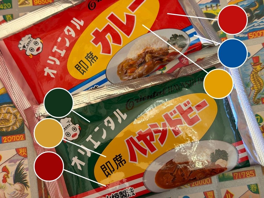 今回は、オリエンタルの即席カレーと即席ハヤシドビーのパッケージ配色を紹介します。